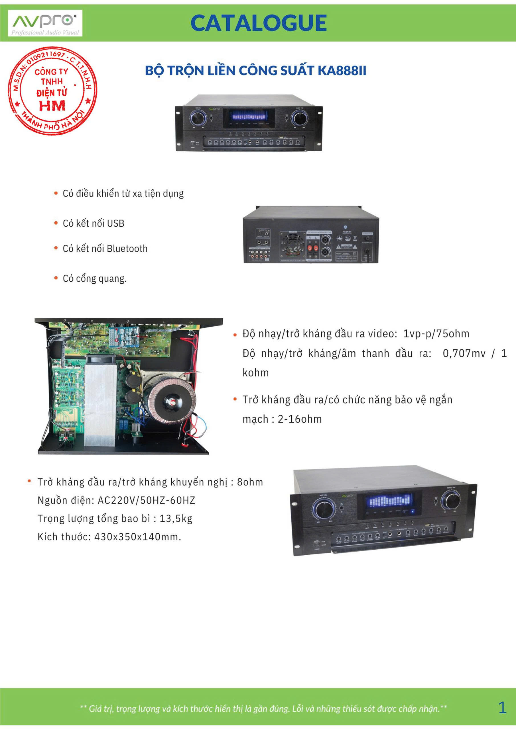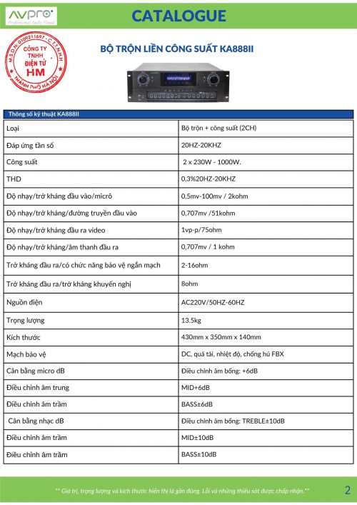 -Amply KA-888II -Có điều khiển từ xa tiện dụng -Công suất 8Ω stereo 350W/CH(Max OUTPUT(4ohm-10000W X 2) -Kết nối Bluetooth Có -Kết nối USB Có -Cổng quang Có -Trở Kháng 8Ohm -Trọng lượng 12kg(NW)-13.5kg(GW) -Điện áp AC 220V/50Hz